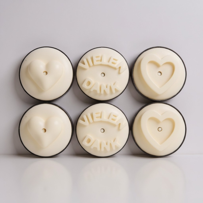 Jedes Set umfasst sechs Teelichter mit drei sorgfältig ausgearbeiteten Motiven: ein ausgefülltes Herz, ein leeres Herz und der Schriftzug „Vielen Dank“.