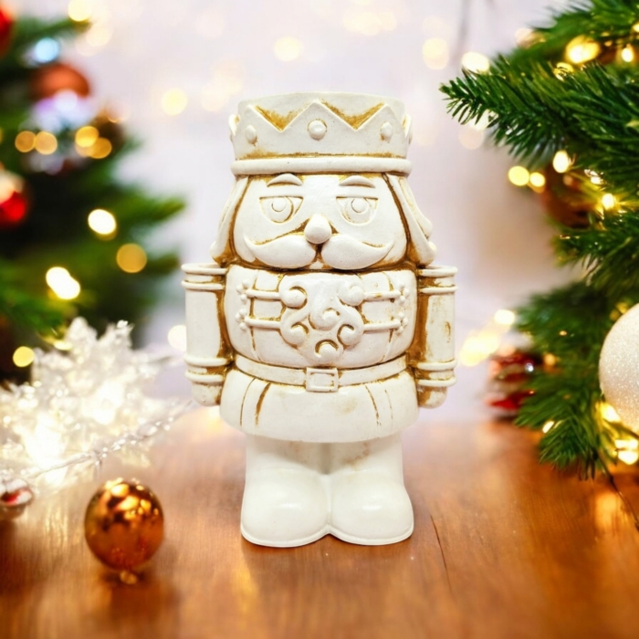 Unser Vintage Nussknacker Kerzenhalter zeugt von Handwerkskunst und Liebe zum Detail. Hergestellt aus hochwertigem Beton und sorgfältig mit einer goldenen Patina verziert, strahlt er eine einzigartige Eleganz aus.